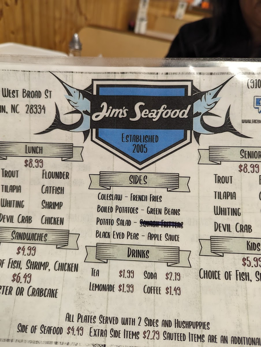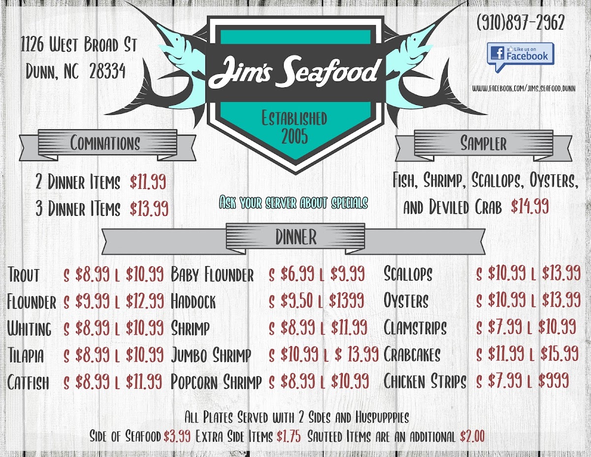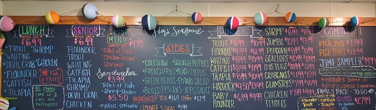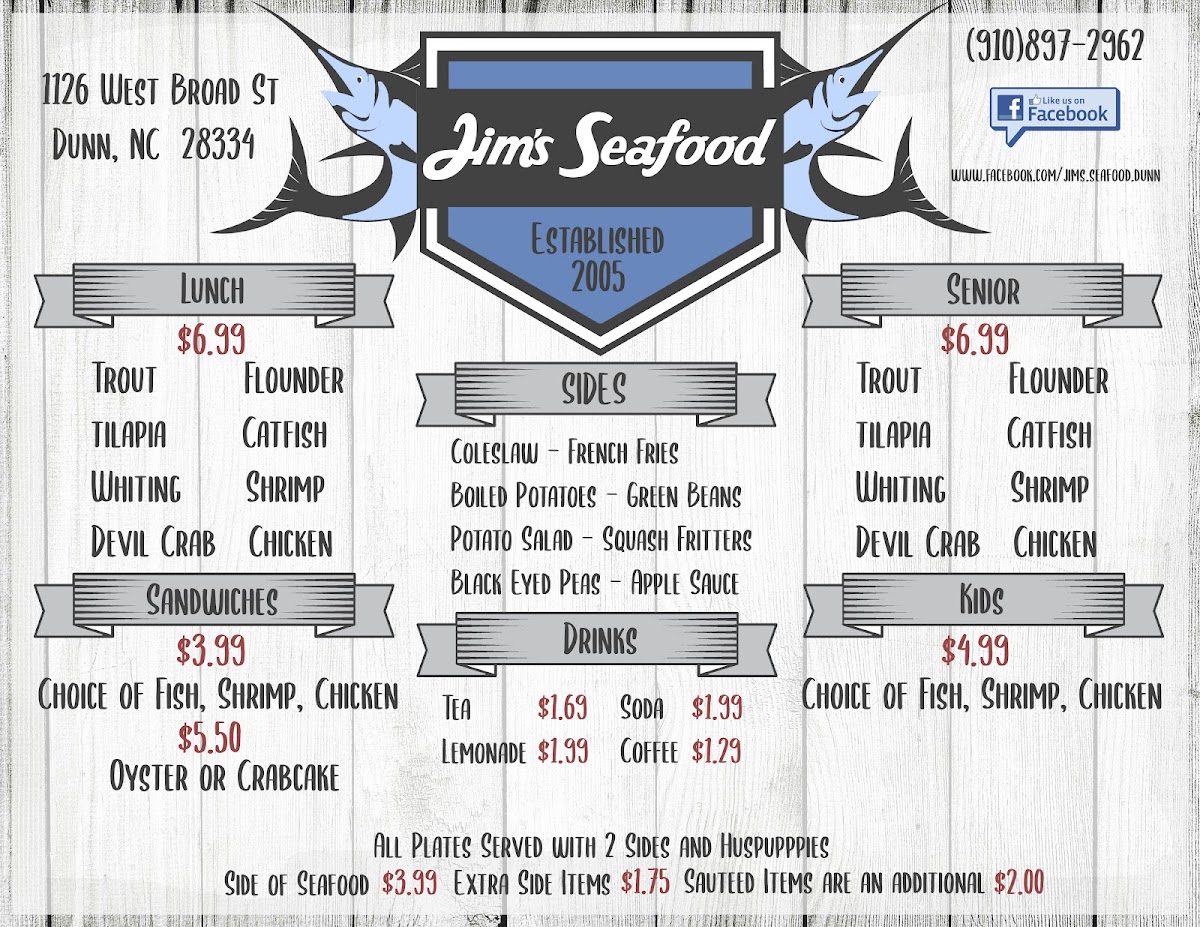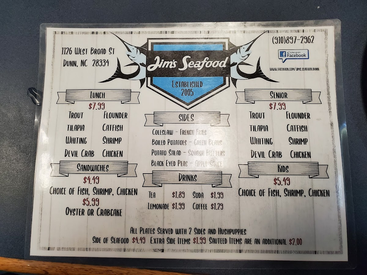 Jim's Seafood Fresh & Fried offers a straightforward, comforting menu that focuses on Southern-style seafood prepared with care. The dishes invite you to settle in for a casual meal, whether it’s a relaxed lunch or an early dinner with family and friends. Expect classic fried fish and fresh-caught options served alongside simple, familiar sides like coleslaw and potato salad, creating a balanced and satisfying experience.